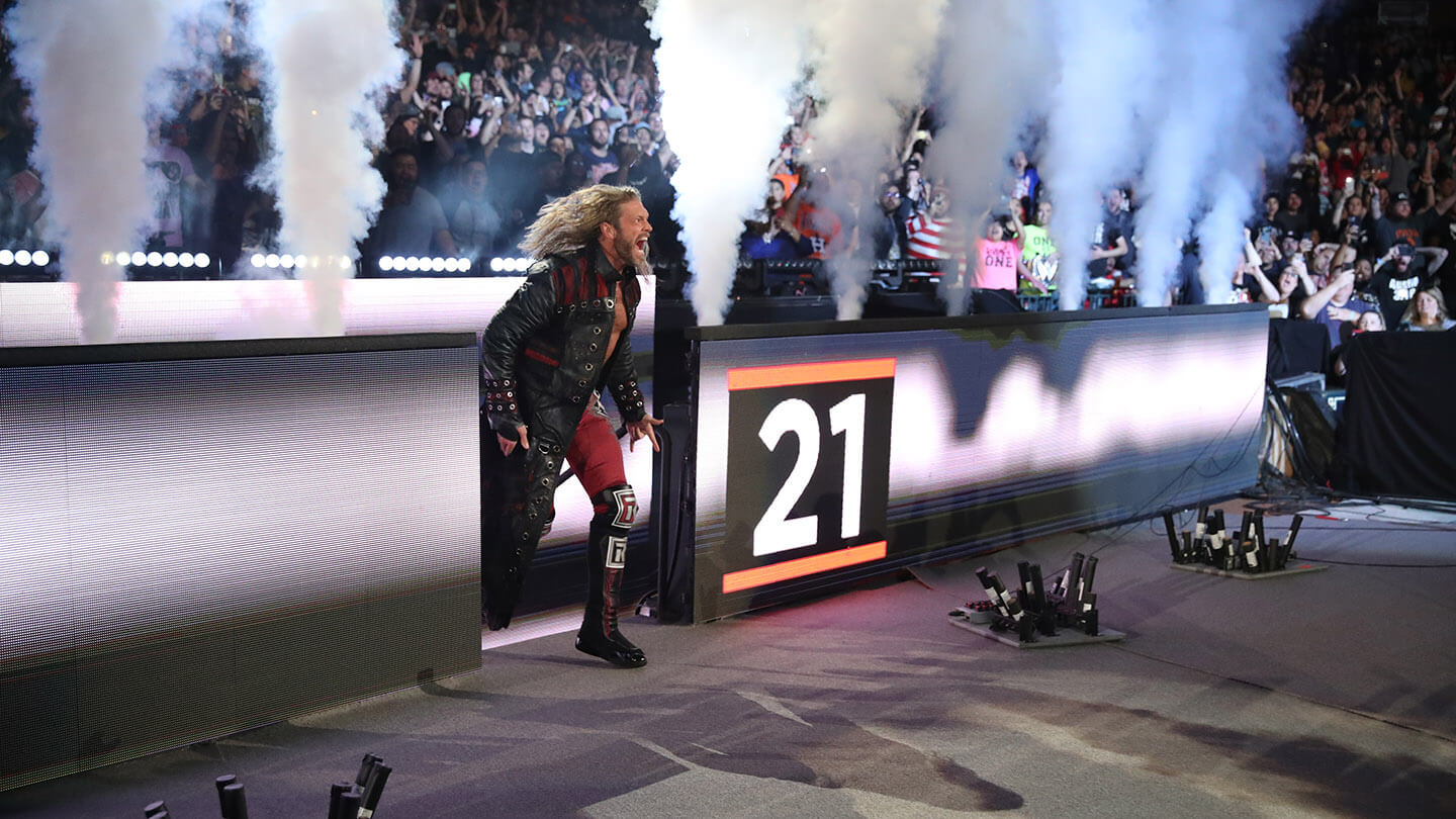 When fans vote in online polls ranking the best entrance music in the business, Edge’s play-in, “Metalingus” by Alter Bridge, usually lands near the top — if not outright looking down on all the others. First come the whispered words (“You think you know me”) and then a grunge Wall of Sound. At that point, Edge always bounced out into the spotlight, drinking in the whole moment, feeding off the volume, enjoying the spectacle from its centre. After a couple of verses, he’d stand, feet spread wide, bowed at the waist and then shoot his arms straight up, reaching for the lights, his head tilted back as the pyro framed him in silhouette. If you took it in sum, the music and the entrance itself, no one arrived better than Edge.